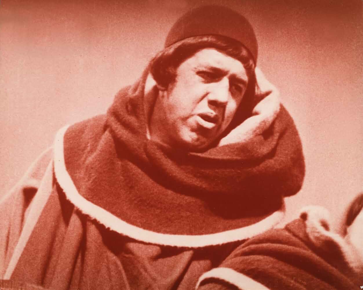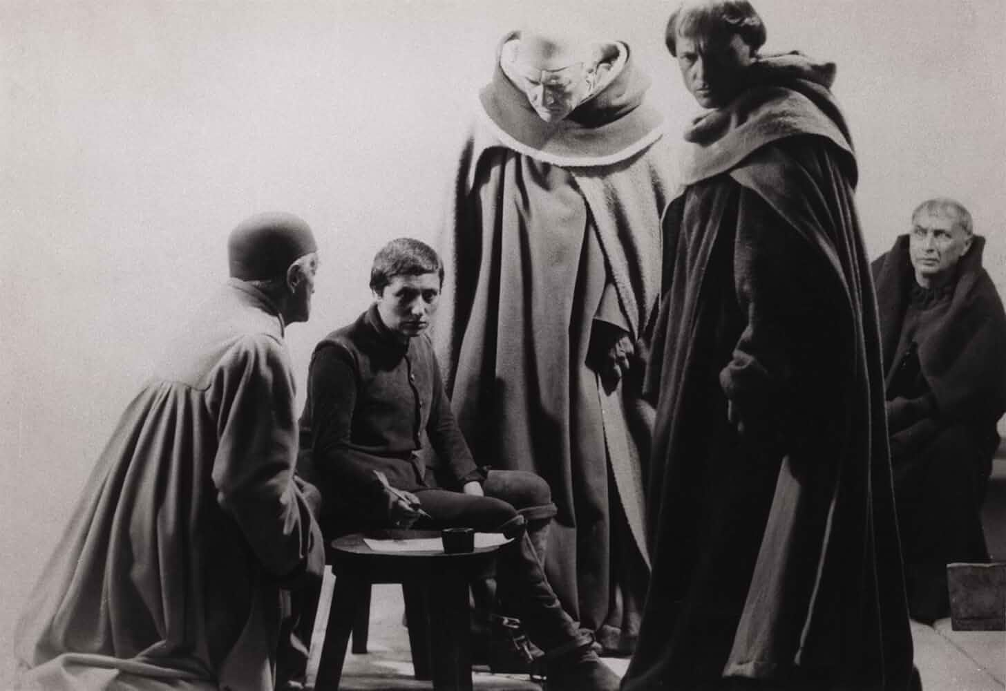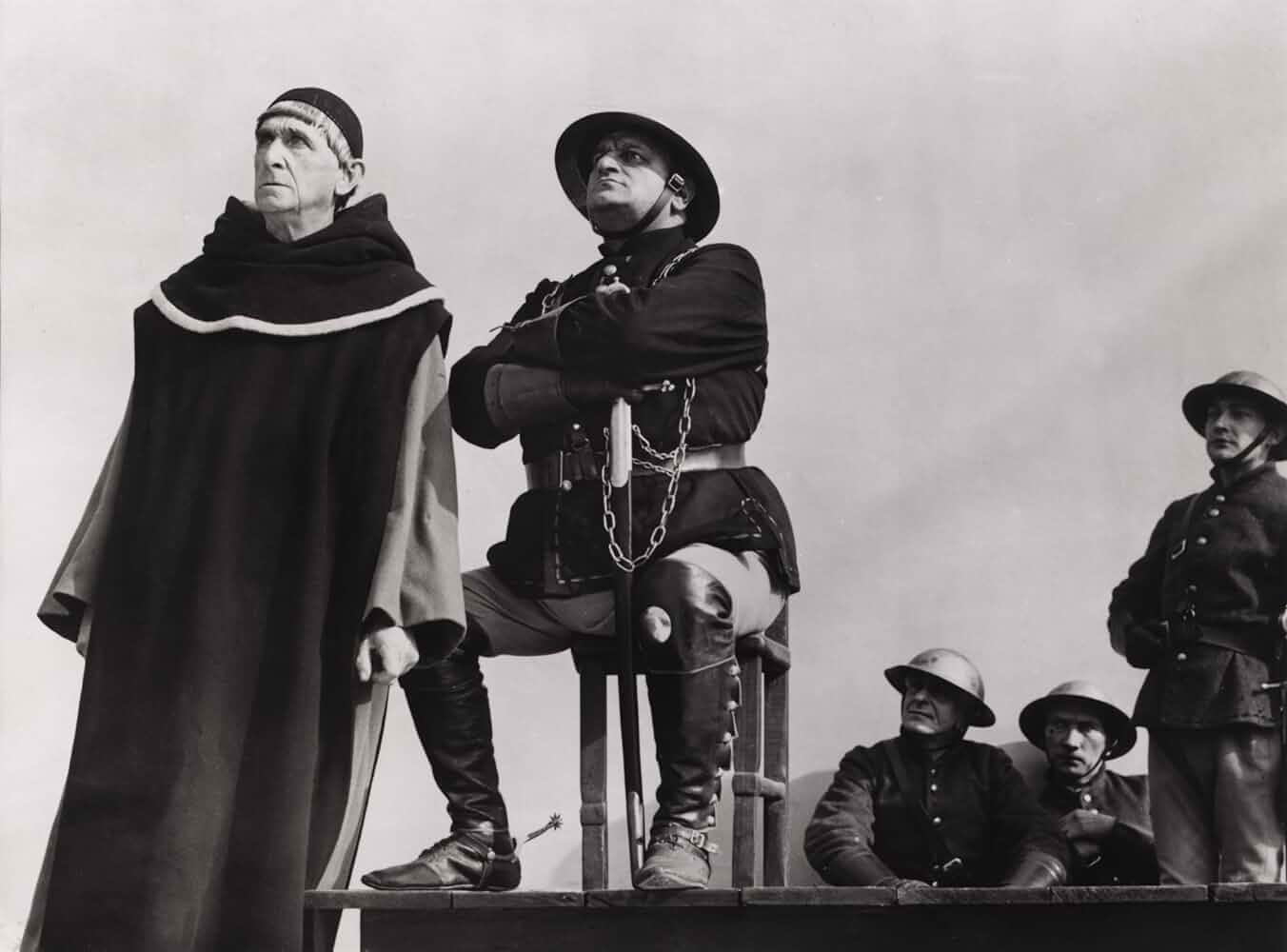 The sufferings of a martyr, Jeanne D'Arc (1412-1431). Jeanne appears in court where Cauchon questions her and d'Estivet spits on her. She predicts her rescue, is taken to her cell, and judges forge evidence against her. In her cell, priests interrogate her and judges deny her the Mass. Threatened first in a torture chamber and then offered communion if she will recant, she refuses. At a cemetery, in front of a crowd, a priest and supporters urge her to recant; she does, and Cauchon announces her sentence. In her cell, she explains her change of mind and receives communion. In the courtyard at Rouen castle, she burns at the stake; the soldiers turn on the protesting crowd.